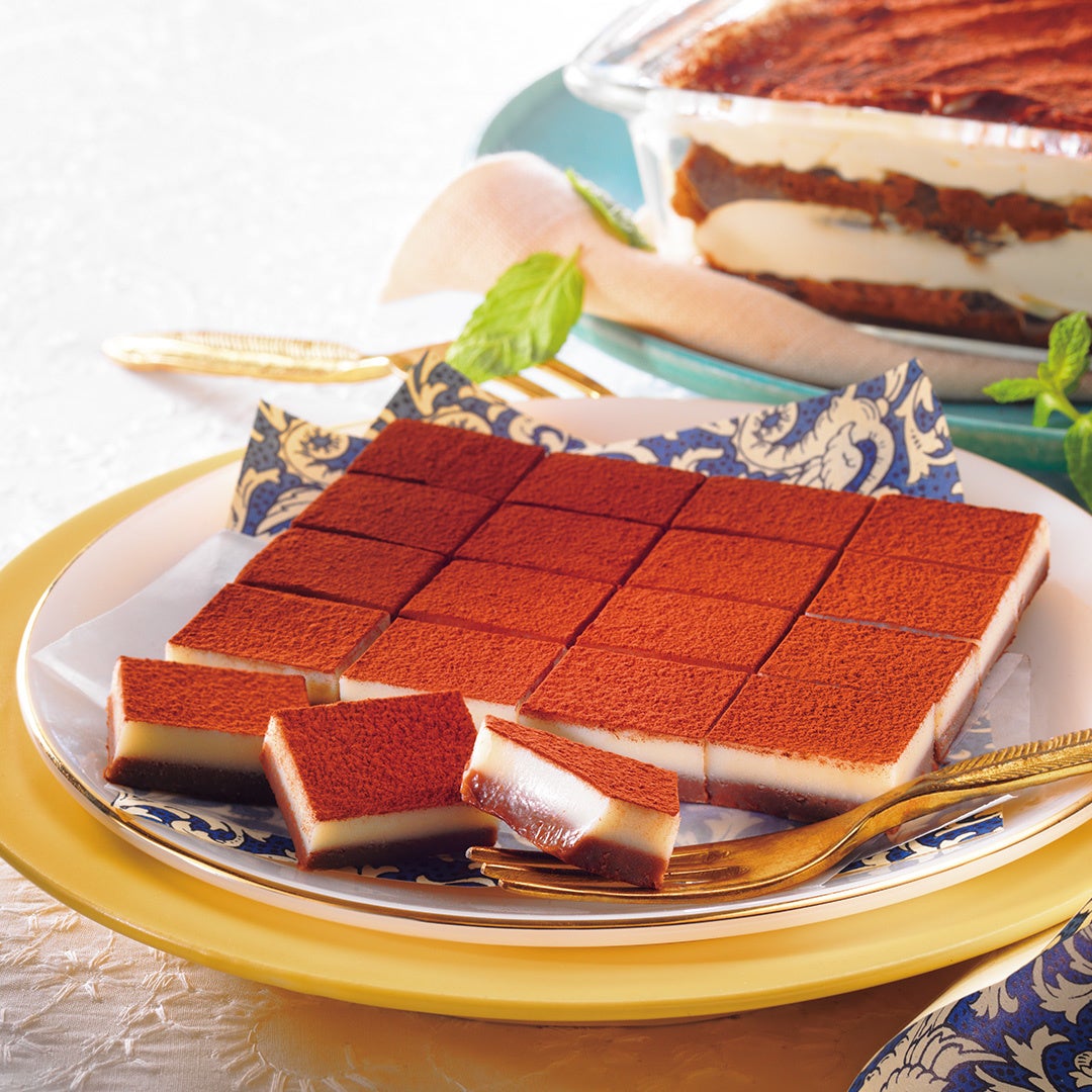 マスカルポーネチーズのパウダーを入れたホワイトチョコレートのガナッシュと、コーヒーとコーヒーリキュール入りのガナッシュを2層に重ね、まるでティラミスを食べているかのような味わいに仕上げました。甘くてほろ苦い、深みのある口どけをお楽しみください。