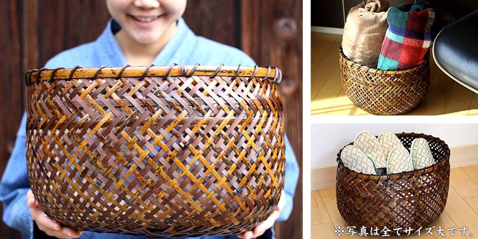 また、縁部分には自然のつる「カズラ」を使用し、素朴で野趣あふれる雰囲気をプラス。内側の底には、虎竹の表皮と身部分を巧みに組み合わせた美しい網代(アジロ)編みが施され、底の補強には「力竹(ちからだけ)」が十文字にしっかりと入れられ、実用性にも優れています。