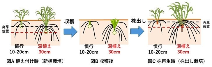 サトウキビの持続的な生産には、生産性が高く環境保全型である株出し栽培を長期間継続することが重要ですが、株出し栽培では、収穫後に地下に残る株から再生してくる茎の発生深度が浅くなり収量の低下や継続回数の減少が課題となっていました。そこで、干ばつが厳しいタイ東北部において、サトウキビの株出し栽培の収量や継続回数を増加させる深植え栽培技術を開発しました。深植え栽培は、慣行植え付けの深さ(10~20㎝程度)よりも深い約30cmの位置に植え付ける栽培方法です(図1)。フィリピンでは、干ばつ年における安定生産への有効性を実証しました。さらに耐倒伏性が向上することにより、台風被害の軽減等が期待されます。