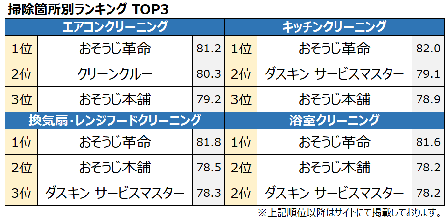 部門では男女別「男性」「女性」、年代別「30代」「40代」「50代」、掃除箇所別「エアコンクリーニング」「キッチンクリーニング」「換気扇・レンジフードクリーニング」「浴室クリーニング」、世帯別「子育て世帯」で1位となり、男女ともに幅広い世代から満足度が高い結果となりました。