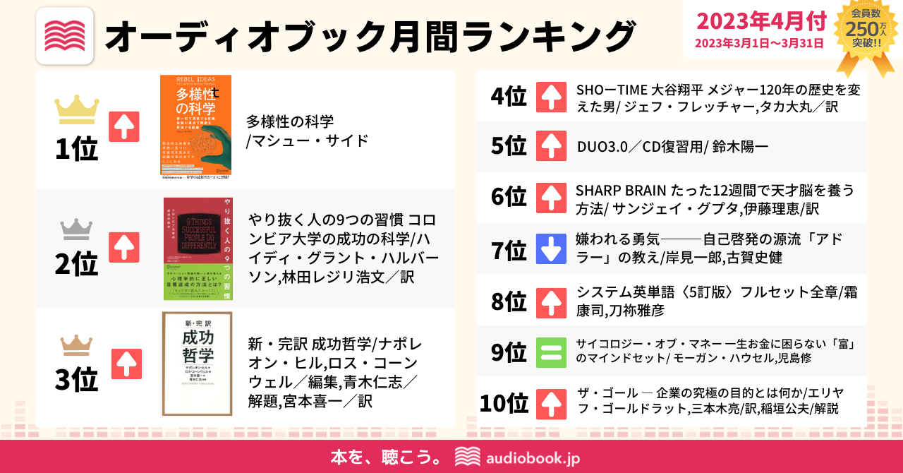 日本一のオーディオブック書籍ラインナップ数(※)を配信する「audiobook.jp」を運営する株式会社オトバンク( 本社:東京都文京区、代表取締役社長:久保田裕也、以下「オトバンク」)は、当社が運営する会員数が250万人を突破した日本最大級のオーディオブック配信サービス「audiobook.jp」におけるオーディオブック月間ランキング4月付(2023/3/1~3/31)を発表します。