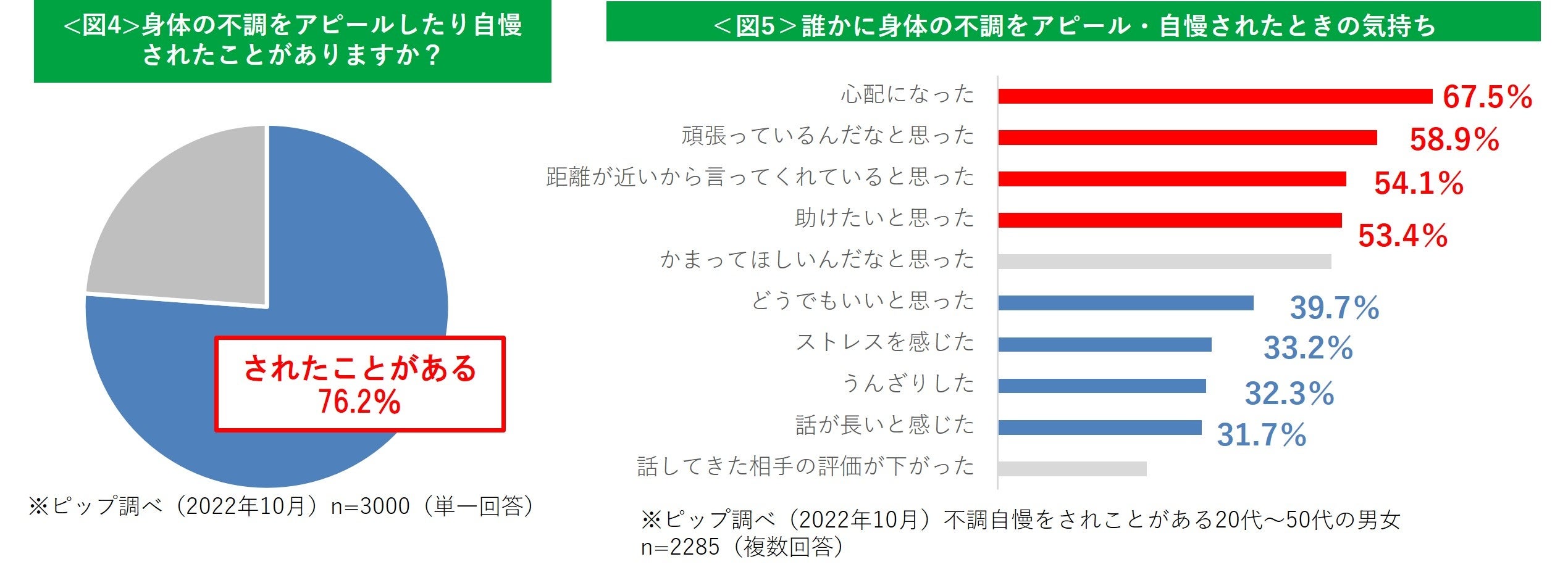 「不調自慢をしたことがある」と回答した人が66.4%だったのに対し、「不調自慢をされたことがある」と回答した人は76.2%に上ることがわかりました。自慢する側よりもされる側のほうが約10ポイント多い結果に。<図4>