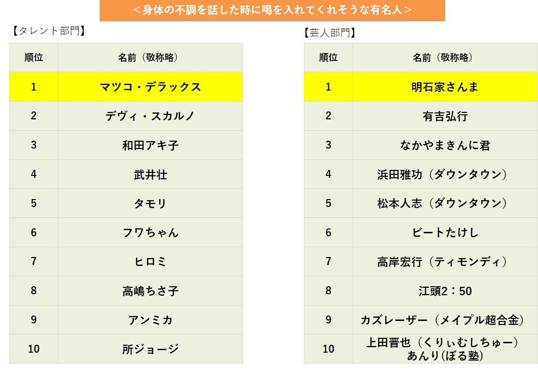 さらに「身体の不調を話した時に喝を入れてくれそうな有名人」ランキングを発表!タレント部門第1位は【マツコ・デラックス】