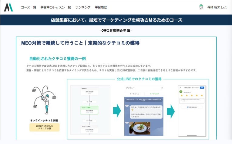 Googleビジネスプロフィール活用やクチコミを活用した店舗改善、InstagramなどのSNS運用方法など、店舗のオンライン集客・評判管理に関連したナレッジを動画と教材、テストを交えながら学習することができます。