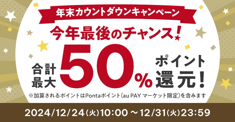 auコマース&ライフは、2024年12月24日から12月31日まで、au PAY ふるさと納税において、au PAY カードやau PAY 残高を利用して寄附いただくと、寄附額に対して3%のPontaポイント(au PAY マーケット限定)を還元する「年末カウントダウンキャンペーン(以下、本キャンペーン)」を開催します。