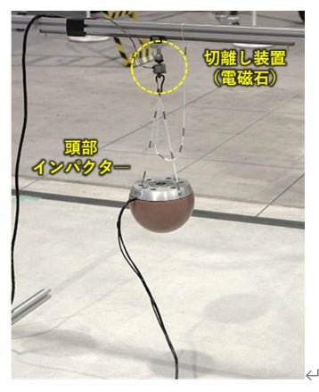 ・試験は下図のように、球体のインパクタでダミー前頭部を打撃する方法