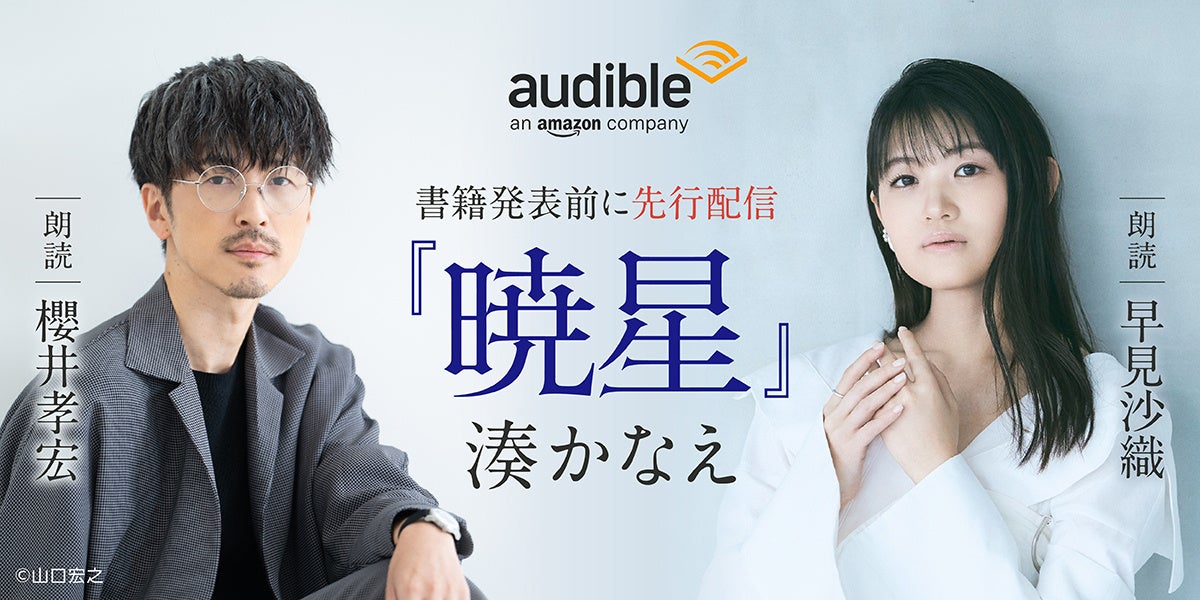 世界最大級のオーディオブックおよび音声コンテンツ制作・配信サービスであるAmazonオーディブル(以下、Audible)は、11月11日より、湊かなえさんによる初のオーディオファースト作品『暁星(あけぼし)』を、声優の櫻井孝宏さんと早見沙織さんの朗読で独占配信開始します。「オーディオファースト作品」とは、第一線で活躍中の作家がAudibleのために書き下ろしたオリジナル新作で、一番最初に「音声」で表現される、Audibleでしか体験できない作品です。