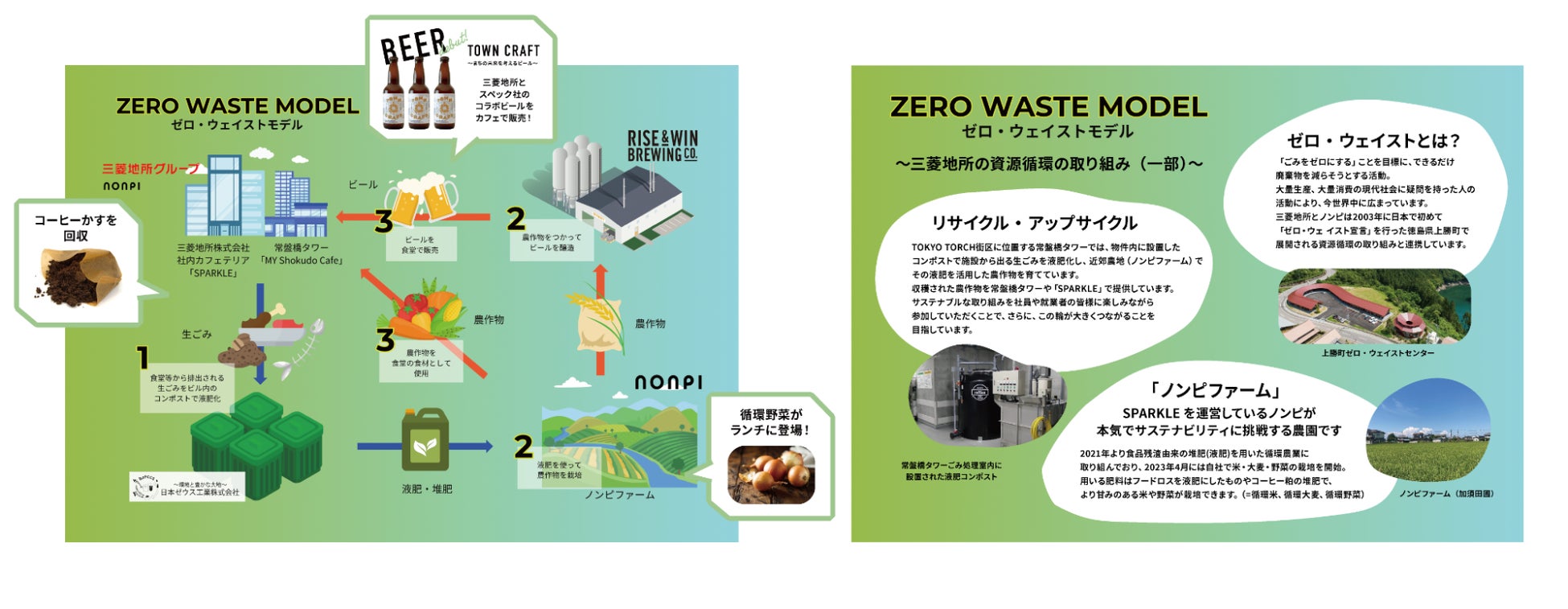 ノンピは、社食でのイベント企画・実施を軸としたコミュニケーションの創出・促進を中心に既存の社食を変革すべく様々な施策を導入しています。三菱地所社内カフェテリア「SPARKLE」でも「ゼロ・ウェイスト社食(*1)」として、廃棄物再利用率100%に向けた取り組み実行と認知拡大のための活動をしています。