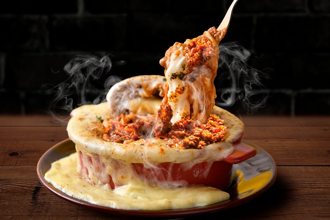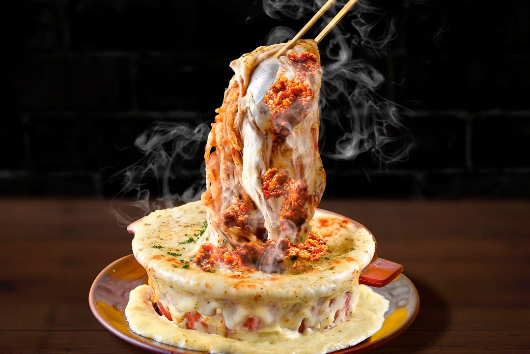 器の外まで溢れ出るとろ~りチーズの中には、溶岩のようにグツグツと沸き立つ肉厚ハンバーグとモチモチ食感のパスタがたっぷり。熱々のハンバーグをお好みの大きさに崩せば、旨み溢れる肉汁が溢れ出し、肉感たっぷりミートソースの出来上がり。豪快にかき混ぜてトングでつかみ上げれば、まさに噴火のような衝撃のインパクト!