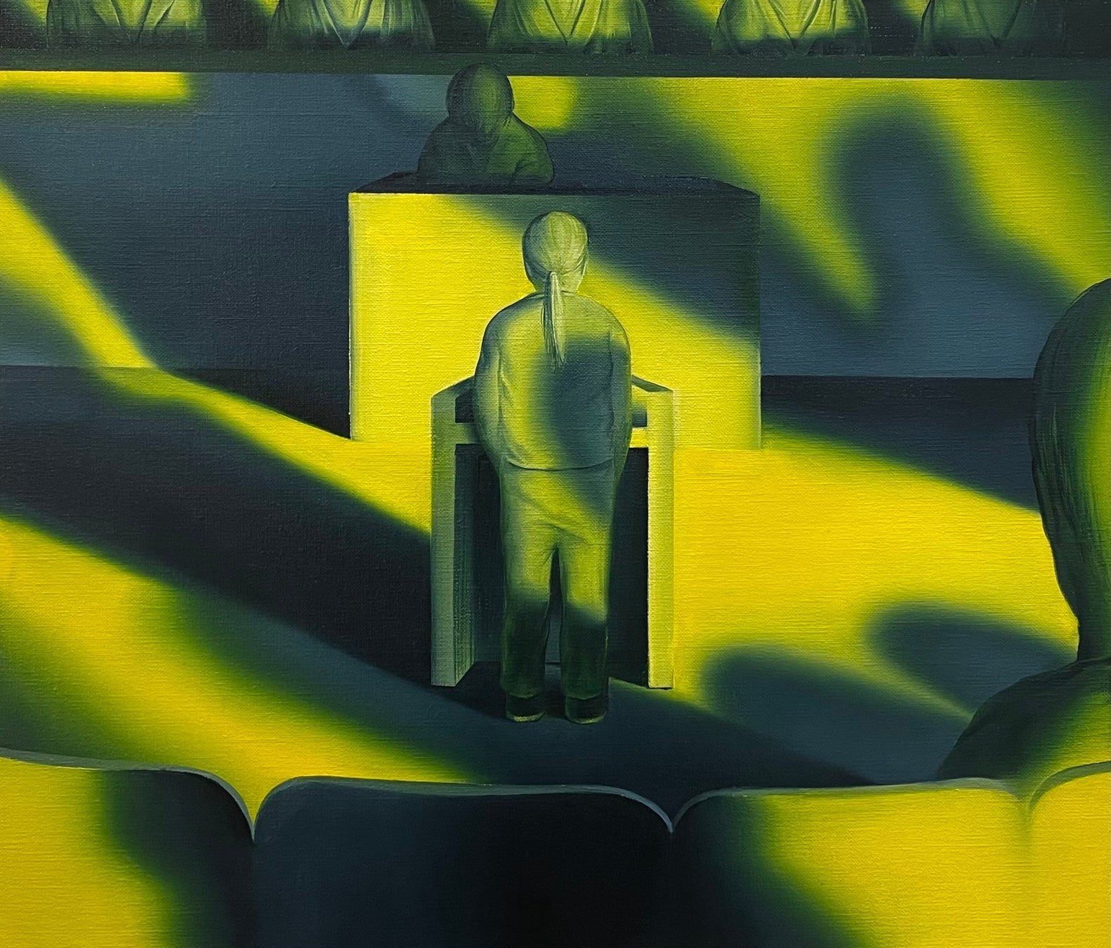 田崎蟻はこれまで、裁判傍聴や野生動物保護ボランティアなどを通して社会の現場を取材し、光と影をモチーフに油彩で作品を発表してきました。ニュースキャスターのように淡々と事実を描き出す一方で、その背後にある矛盾や揺れ動く感情をすくい取り、社会の奥行きを映し出してきました。