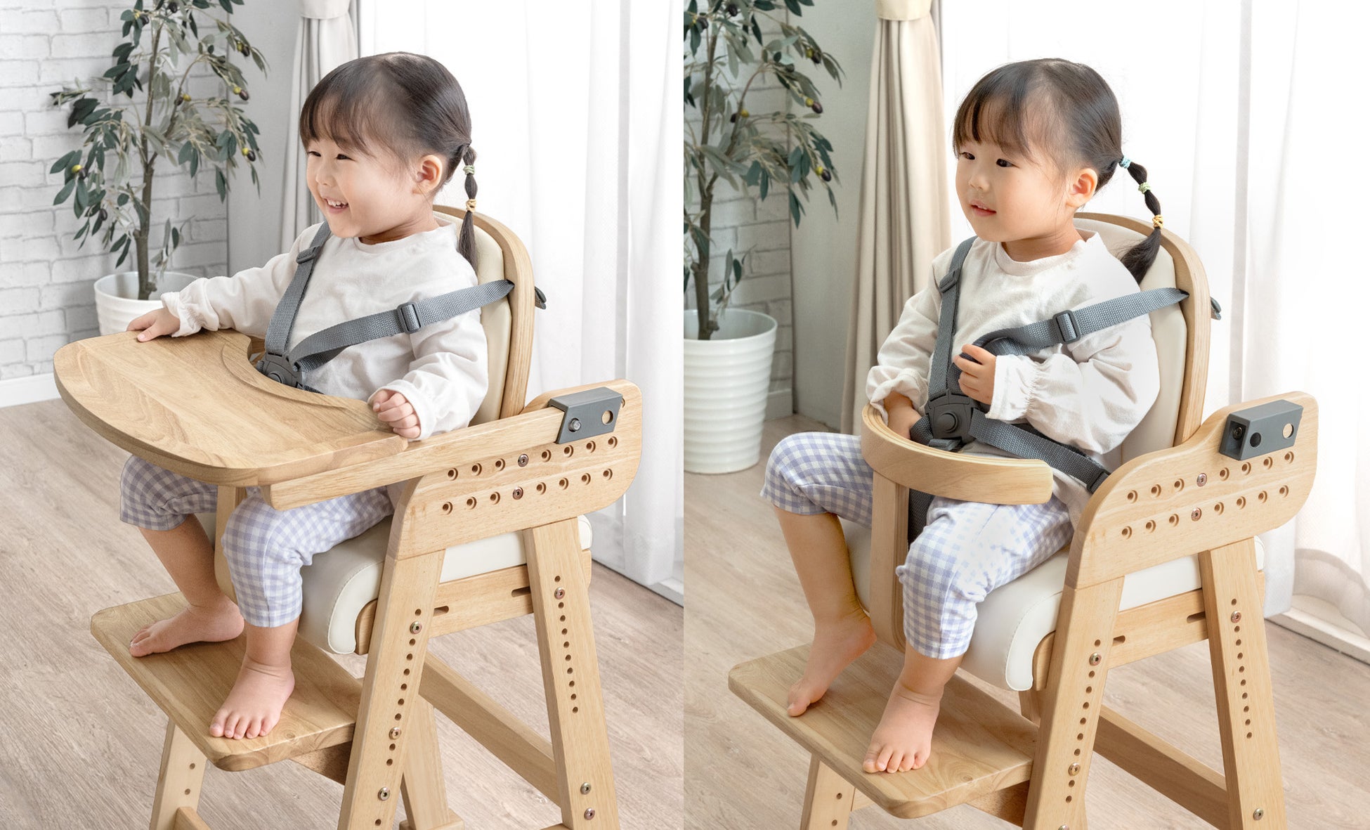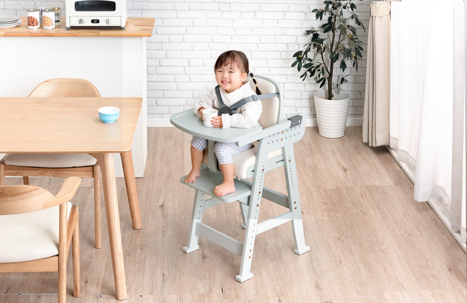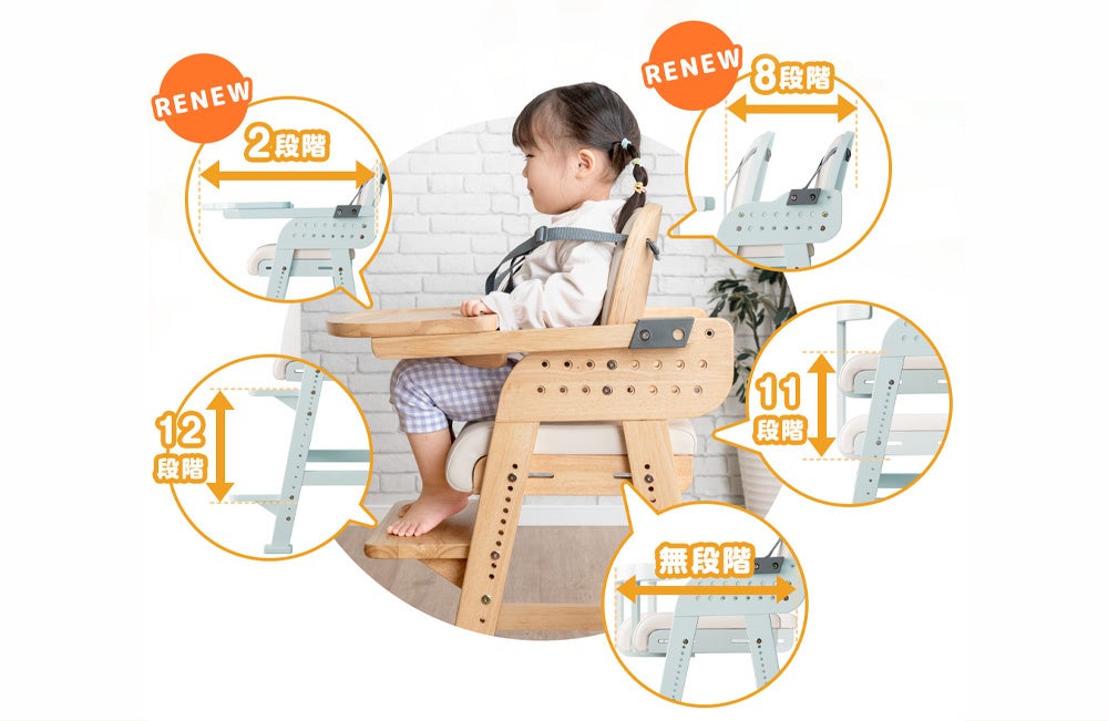 成長に合わせて高さや奥行調整が可能な『テーブル付きベビーチェア』がリニューアル!乳児期からぴったり快適!小柄なお子さまにやさしくフィットする多段階調整チェア