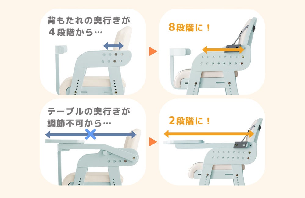 成長に合わせてフィット!テーブル・背もたれの調整機能が進化
