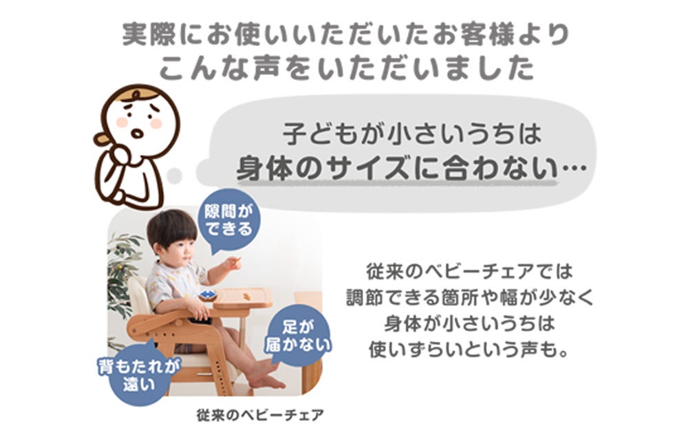 そのシリーズとして「テーブル付きベビーチェア」も多くのお客様にご愛用いただく中で、特に乳児期のお子さまは体格が小さく、「体に対してテーブルとの距離が合わない」「背もたれの調整幅が足りず、足がぶらぶらして姿勢が安定しない」といったご意見をもとに、今回、安全性と多機能性を高め、より快適にご使用いただけるようリニューアルいたしました。