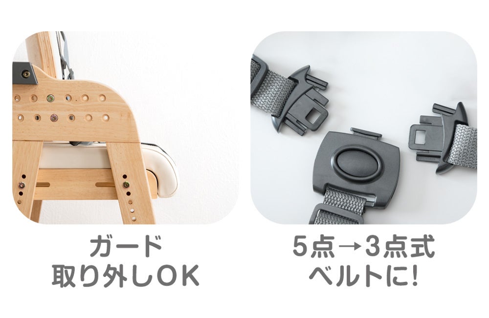 また、身体のバランスを自分でとれるようになる頃には肩ベルトを外して3点式に切り替えることが可能です。