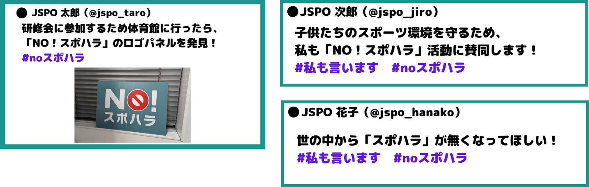 このアクションは、個人や団体がご自身でお持ちのSNSにおいて主体的に「NO!スポハラ」を発信いただくとともに、当該発信者とSNS上でつながる多くの方にも「NO!スポハラ」を周知することを目指したものです。