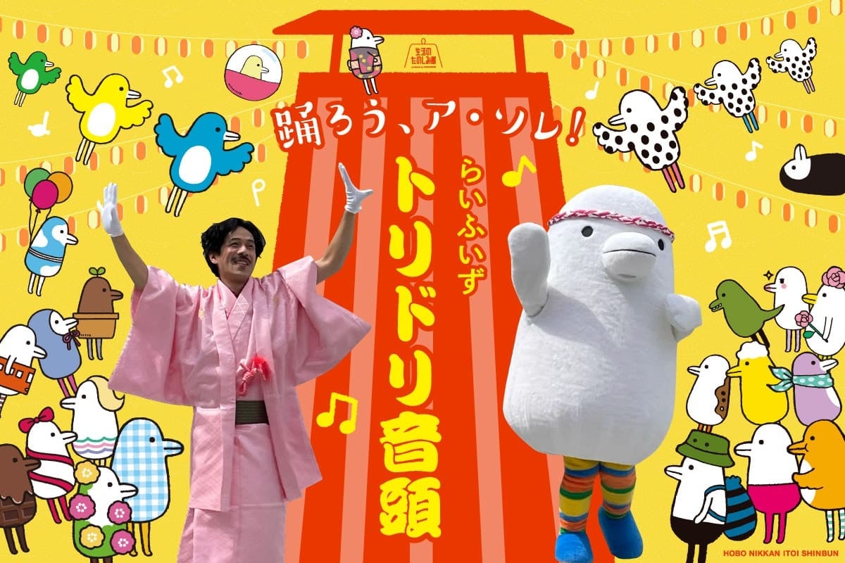 この音頭にはレ・ロマネスクさんによる踊りの振り付けがあります。踊りの振り付けがよくわかるコンテンツページも4月22日に公開されますが、完璧に覚えなくてもかまいません。「生活のたのしみ展」でいっしょに覚えて踊りましょう。レ・ロマネスクのおふたりは、期間中の夕方に何回か、「らいふいずほぼトリドリ音頭」の生歌を披露してくださる予定です。