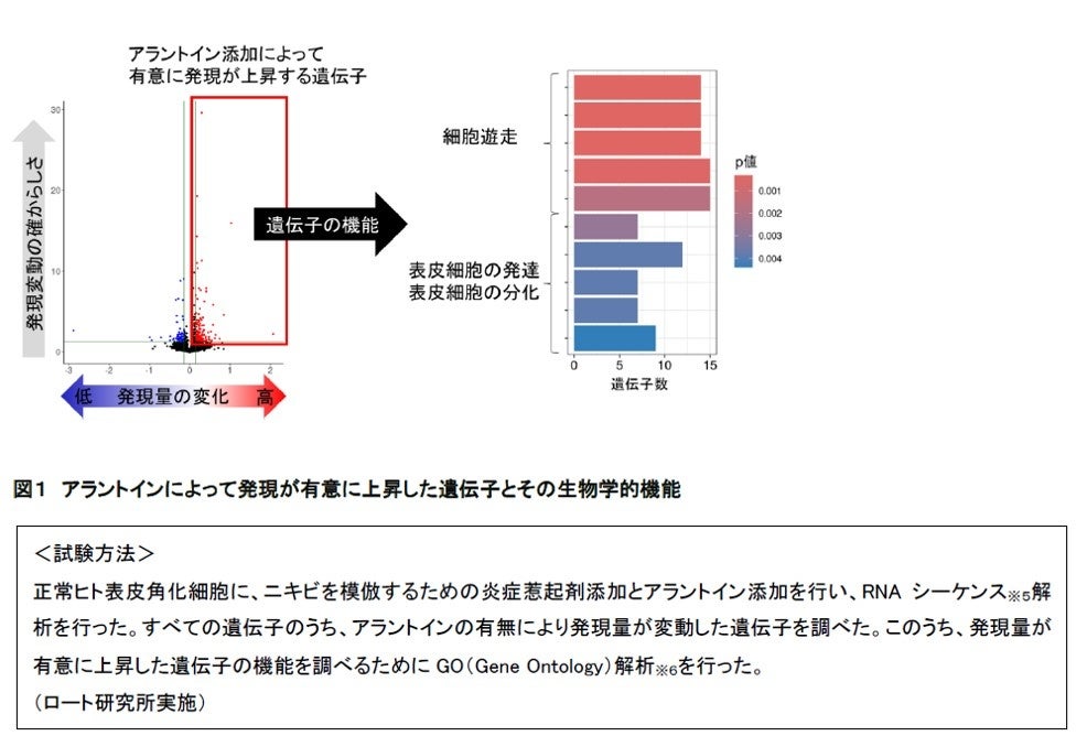 表皮角化細胞において、アラントインの添加の有無によりどのような遺伝子の発現が変化しているのかを調べるために、次世代シーケンスデータ解析によってRNAの発現量を網羅的に解析しました。その結果、アラントインの添加によって発現が上昇する遺伝子は、表皮角化細胞の角化等に関連することを確認しました。表皮細胞の角化とは、肌の最外層である表皮に存在する細胞が順序だって分裂・成熟し、最終的に硬くて耐久性のある角質層となるプロセスのこと、つまりは表皮細胞におけるターンオーバーを指します。この結果より、アラントインが表皮細胞の角化誘導により肌のターンオーバーを促進することが示唆されました。