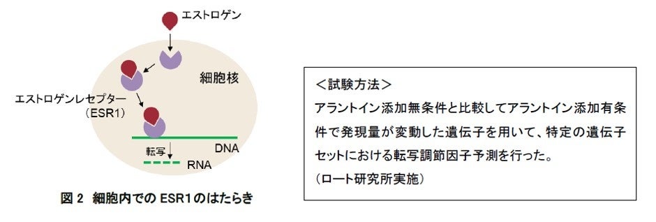 ◆ アラントインが、エピジェネティック※3な制御を介してエストロゲン受容体をコードする遺伝子であるエストロゲンレセプター1(ESR1)の転写因子※4としての働きを活性化し、ヒト表皮角化細胞のターンオーバーに関連する遺伝子の発現を上げる