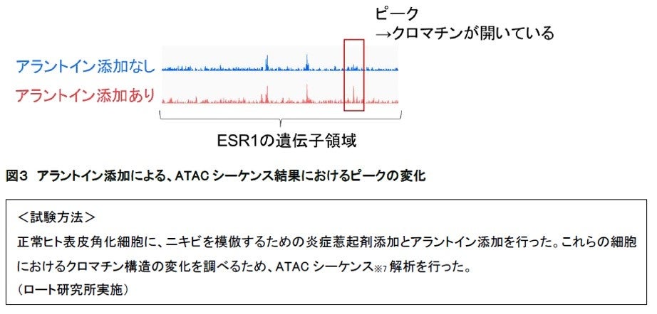 表皮角化細胞に対してアラントインがESR1の活性化どのように制御しているのかを調べるために、ATAC(Assay for Transposase-Accessible Chromatin)シーケンスデータ※7を用いて、アラントイン添加の有無によりESR1のクロマチン構造の変化を調べました。その結果、アラントインの添加によってESR1の一部の遺伝子領域のクロマチンが開くことが明らかになりました。このことから、アラントインはESR1に対してエピジェネティックな制御を行っていることが明らかになりました。