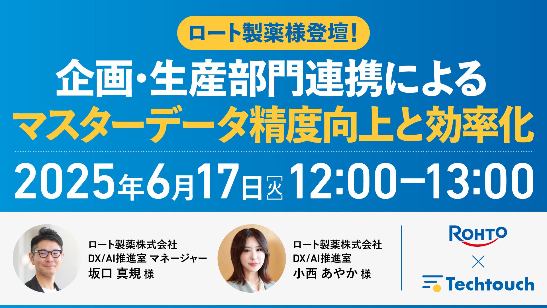 AI型次世代DAP「テックタッチ」を開発・提供し、DAP市場国内シェアNo.1のテックタッチ株式会社は、ロート製薬株式会社(本社:大阪市生野区、以下 ロート製薬)をゲストに招き、2025年6月17日(火)12時からオンラインセミナーを開催します。