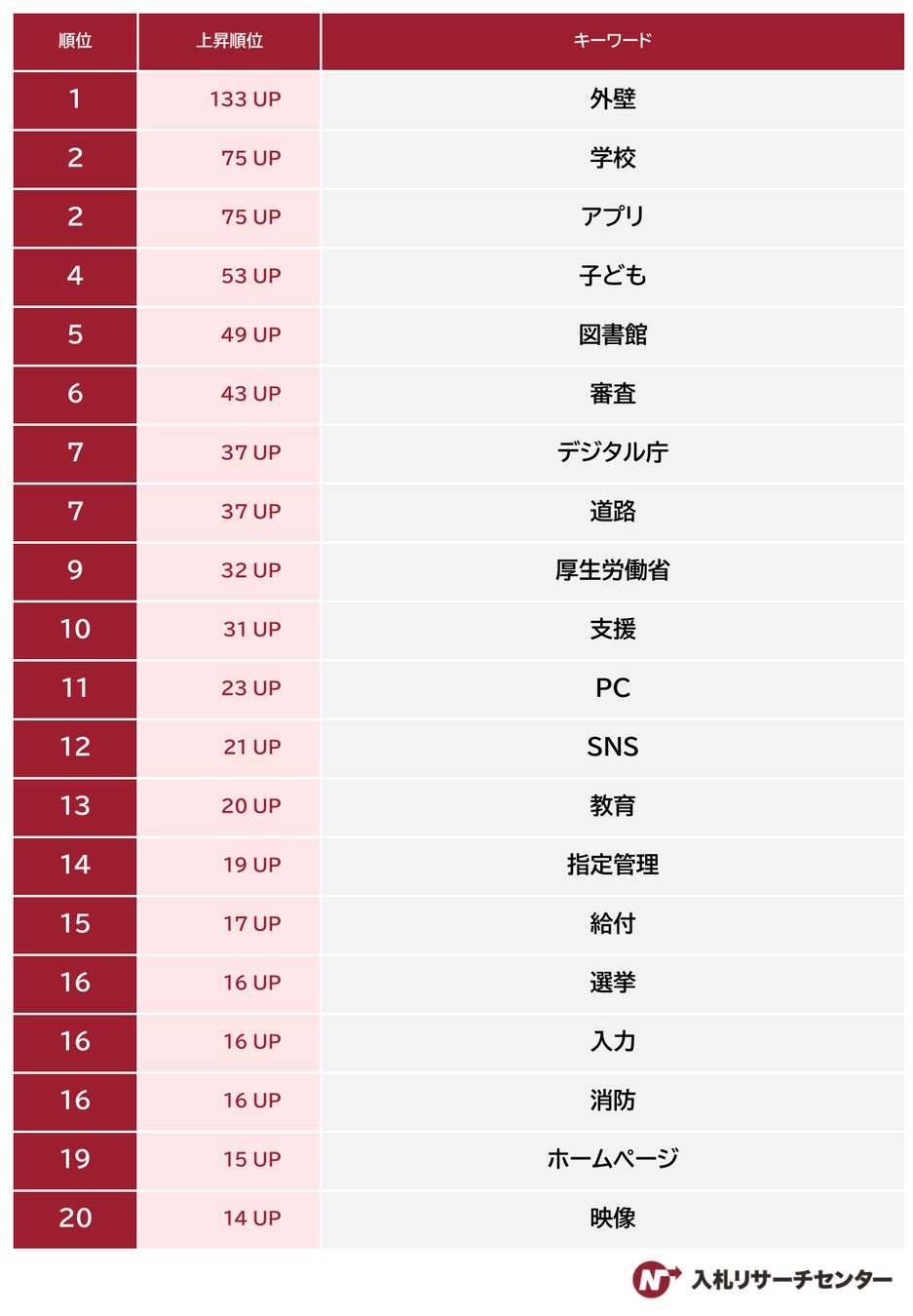 2024年10月1日~10月31日に「NJSS」内で検索されたキーワードのうち、前月と比較して上昇幅の大きいキーワードを「入札検索キーワード 急上昇ランキング 」として発表いたします。