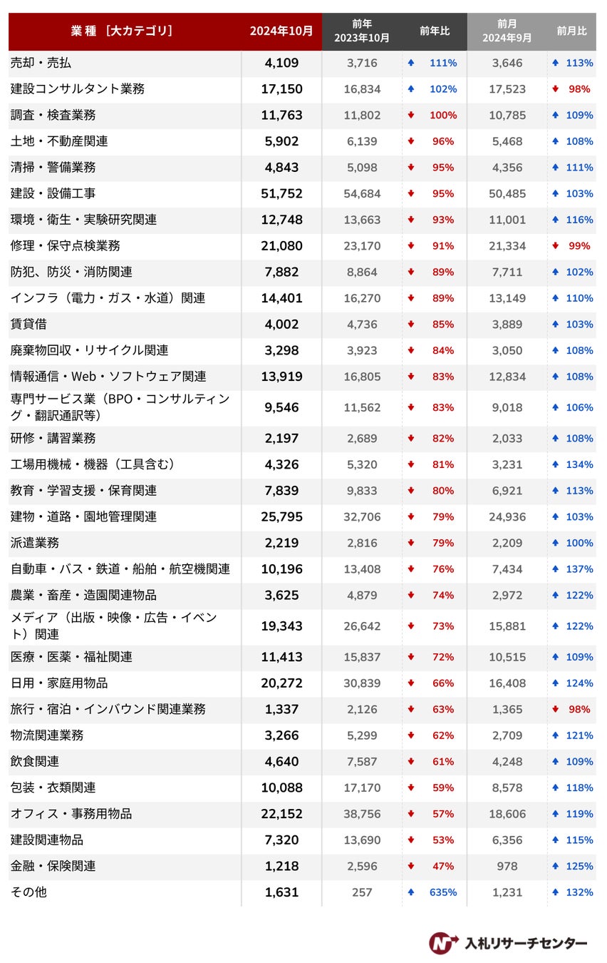 2024年10月の業種カテゴリ別公示案件数は、多くの業種が減少傾向となりました。
