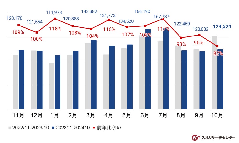 2024年10月の落札案件数の総計は124,524件で、前年比82%となりました。