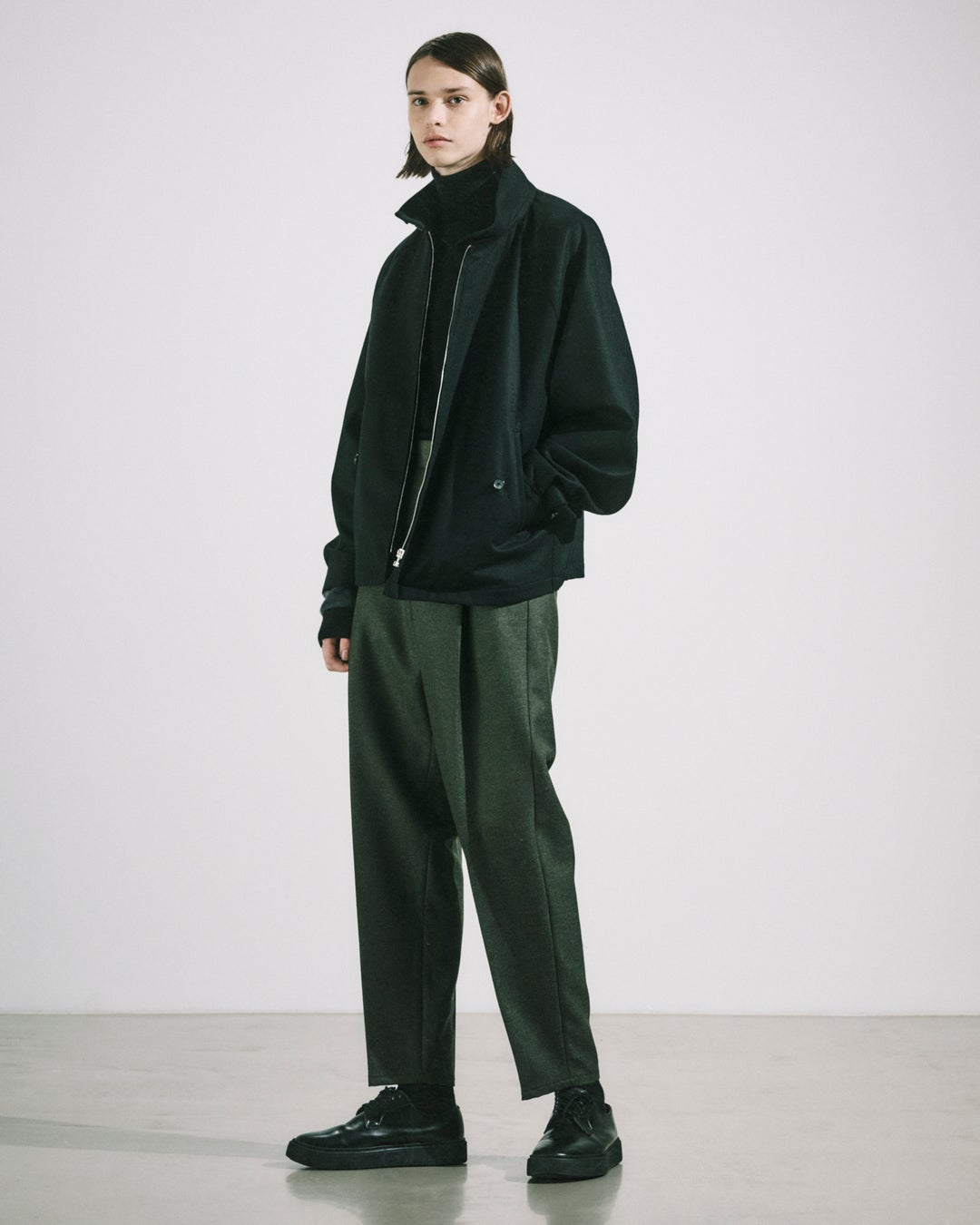 “バルカラーポンチョ“、”フライトジャケット“、”バックベルトトラウザース“をベースに生地別注。