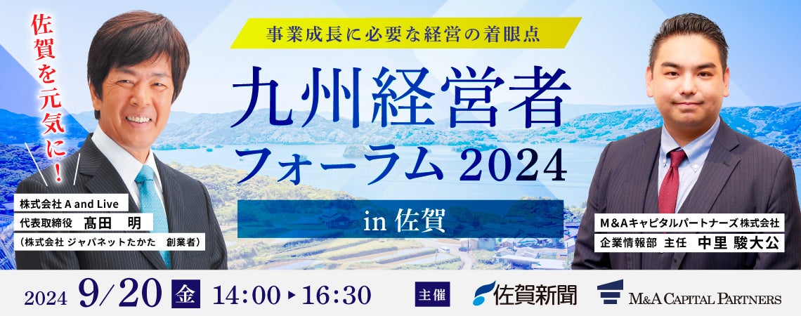 M&Aキャピタルパートナーズ株式会社(東京都中央区・代表取締役社長 中村 悟) は、佐賀新聞社との共催セミナー「九州経営者フォーラム2024 in 佐賀」を2024年9月20日(金)に開催いたします。急激な社会の変化に対して、佐賀県内の企業が今後どのように 対応していかなければならないのか。事業を成長・発展させるための経営戦略についてお話しさせていただきます。