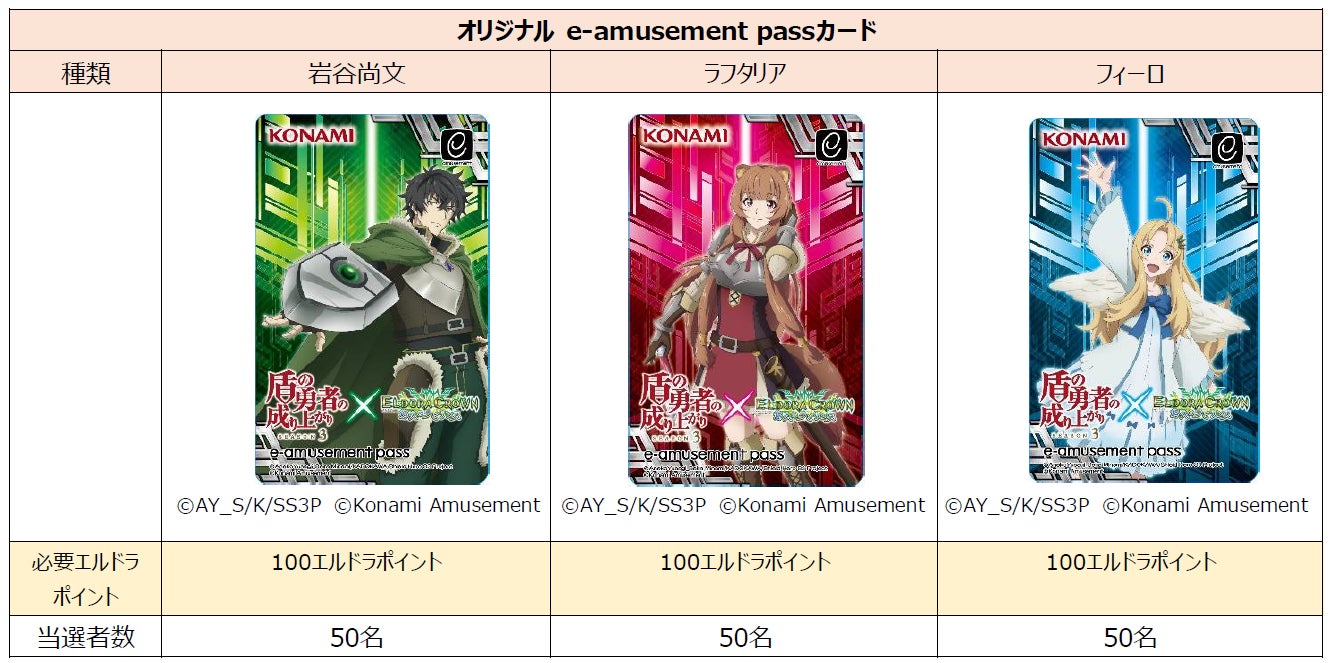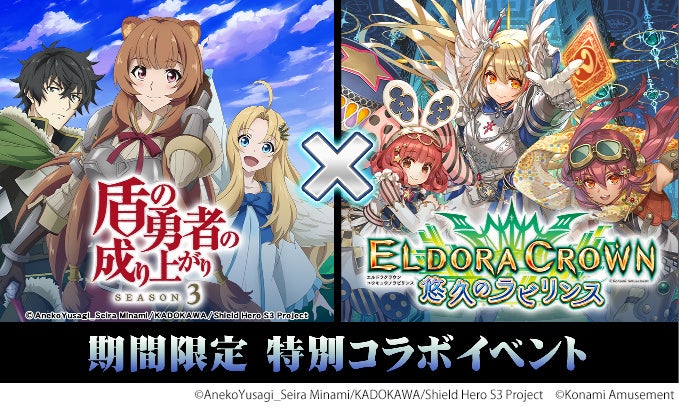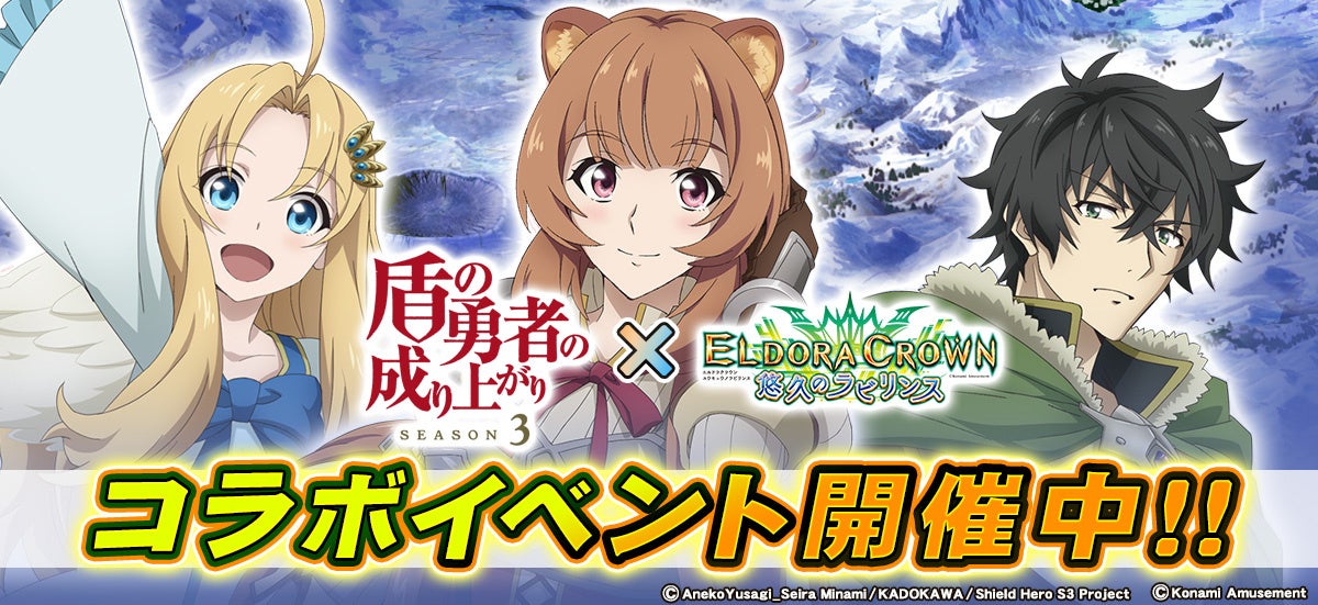 アニメ『盾の勇者の成り上がり Season 3』とのコラボレーションを記念して、アーケード版『エルドラクラウン 悠久のラビリンス』とコナステ版『エルドラクラウン 悠久のラビリンス コナステ』では「オリジナルe-amusement passカード」や「オリジナルアクリル