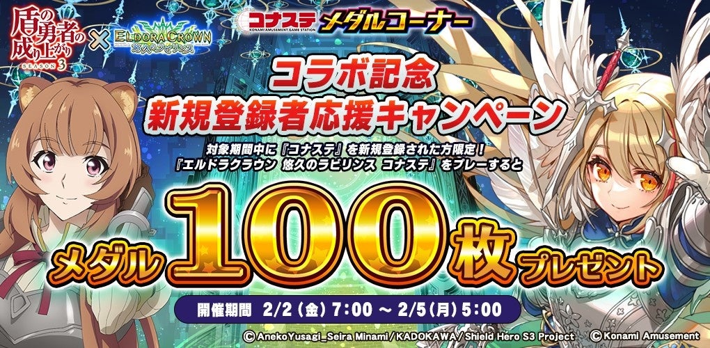 株式会社コナミアミューズメントは、全国のアミューズメント施設にてメダルゲーム『エルドラクラウン 悠久のラビリンス(エルドラクラウン ユウキュウノラビリンス)』とPCやスマートフォンでアーケードゲームが楽しめる「コナステ メダルコーナー」『エルドラクラウン 悠久のラビリンス コナステ』にて、アニメ『盾の勇者の成り上がり Season 3』とのコラボレーションイベントを2月1日(木)から2月29日(木)まで開催することをお知らせします。