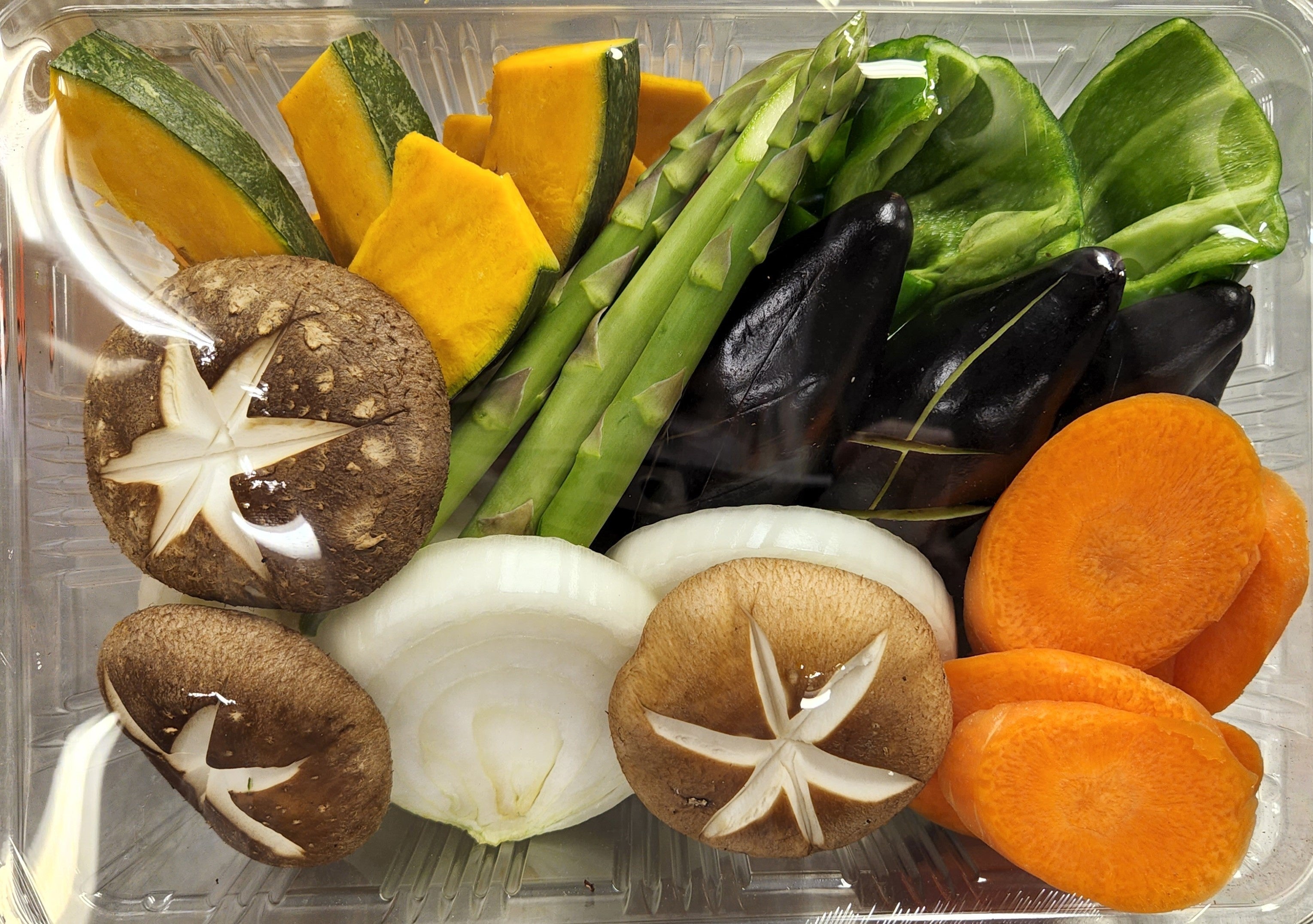 1910年創業の老舗青果店。ナス、人参、タマネギ、カボチャ、ピーマン、椎茸などのセットを販売します。新鮮な野菜の盛合わせをカットしてご提供します。