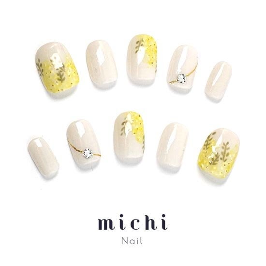 肌をきれいに見せてくれるベージュカラーのベースと、指先にイエローのミモザが咲いたネイル。ポイントで飾られたストーンがジュエリーをつけているようで、ネイル全体がより一層華やかになります。
