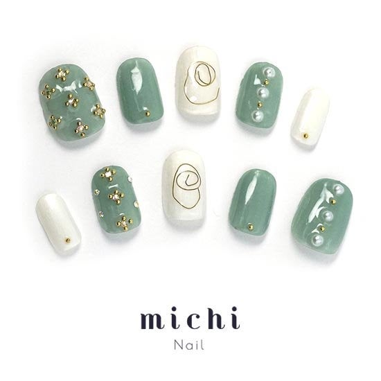この季節にピッタリなヒスイ色とホワイトがベースのネイル。ゴールドのワイヤーがちょっぴり個性的なデザインです。梅雨から夏まで楽しめる爽やかなカラーと程よいキラキラ感で使いやすいおすすめネイルです。
