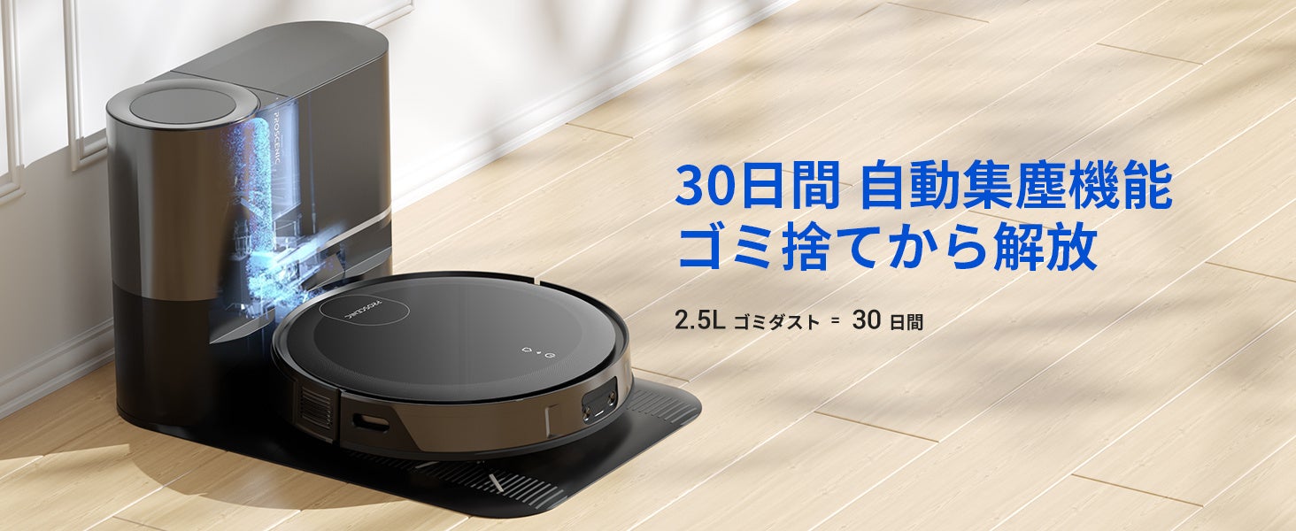 自動ゴミ収集ダストバッグを付きロボット掃除機です。2.5リL大容量ダストバッグで、30日間ホコリや髪の毛などのゴミを触らなくても安心してご使用いただけます。