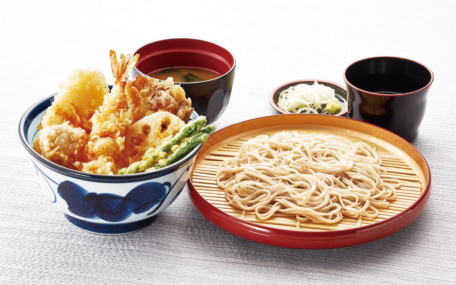メイン商品は高品質でお値打ち価格の天丼と天ぷらです。天ぷらによく合うそば・うどん、冷たいソフトドリンクも提供いたします。