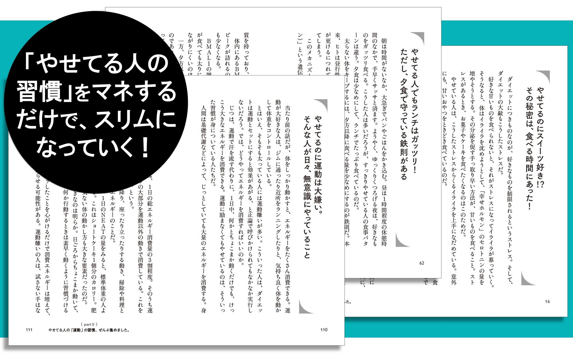 本書は、「やせてる人」の習慣を、食べ方、メンタル、睡眠、ケア、運動、考え方、動作など、さまざまな側面から紹介します。