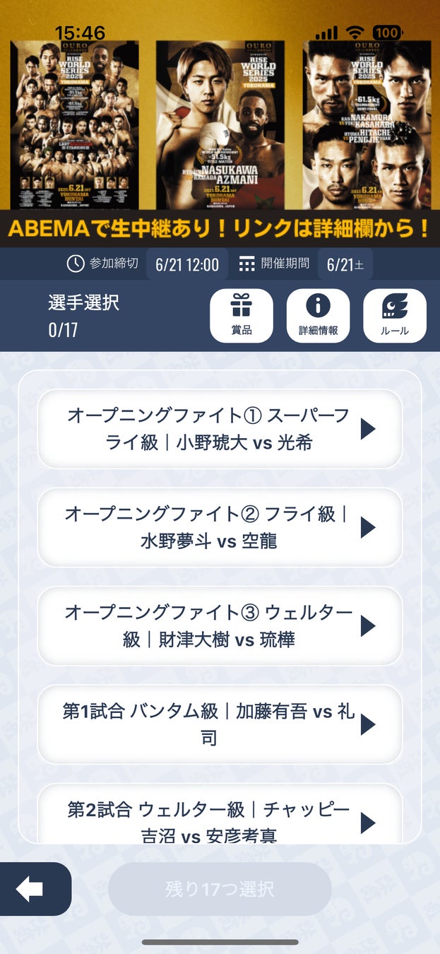 全17試合の勝敗を予想(選手 × KO・TKO勝ち/選手 × 判定勝ち/引き分け)