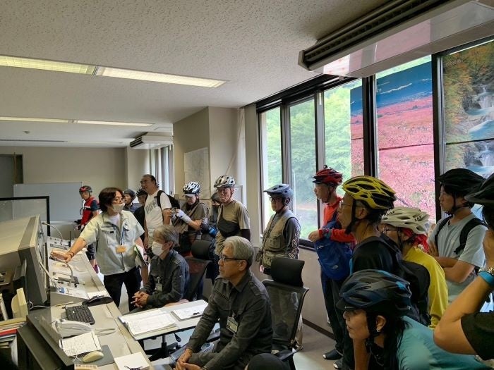 普段は立ち入ることのできない雁坂トンネルの避難坑を自転車で走り、県境を越えて埼玉県まで走行できることが本ツアー最大の魅力です。さらに、本ツアーでは特別に雁坂トンネル管理事務所内にある監視室(24時間体制でモニターにてトンネル内の監視を行い、トンネルやドライバーの安全を守っている部屋)を見学することができました。