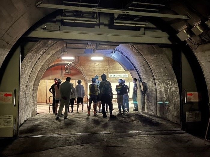 管理事務所の見学を終え、ついに避難坑の中へ。避難坑入口では、各グループの代表者2名が協力して扉を開けました。トンネル内はひんやり涼しく、夏でも快適にサイクリングを楽しむことができました。