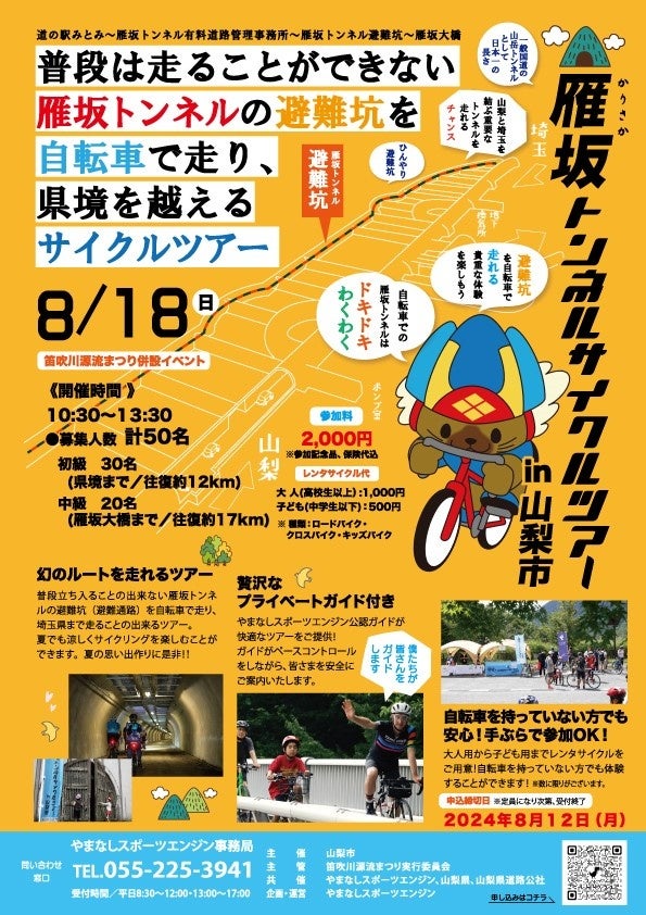やまなしスポーツエンジンが企画・運営を行い、山梨県と埼玉県の県境を越える「雁坂トンネルサイクルツアー in 山梨市」を令和6年8月18日(日)に開催しました。