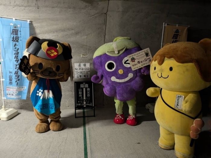山梨県と埼玉県の県境では、富士の国やまなし観光キャラバン隊長のゆるキャラ、武田菱丸(たけだひしまる)くんをはじめ、山梨市のキョッシー、秩父市のポテくまくんが参加者をお出迎えしました。