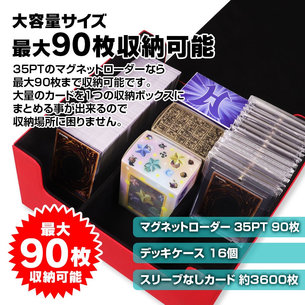 そのままのカードは約3600枚、35PTマグネットローダーは最大90枚、カードローダーは約300枚、デッキケースは約16個収納可能です。トレーディングカードで悩みの収納問題をこのBOX1つで解決できます!