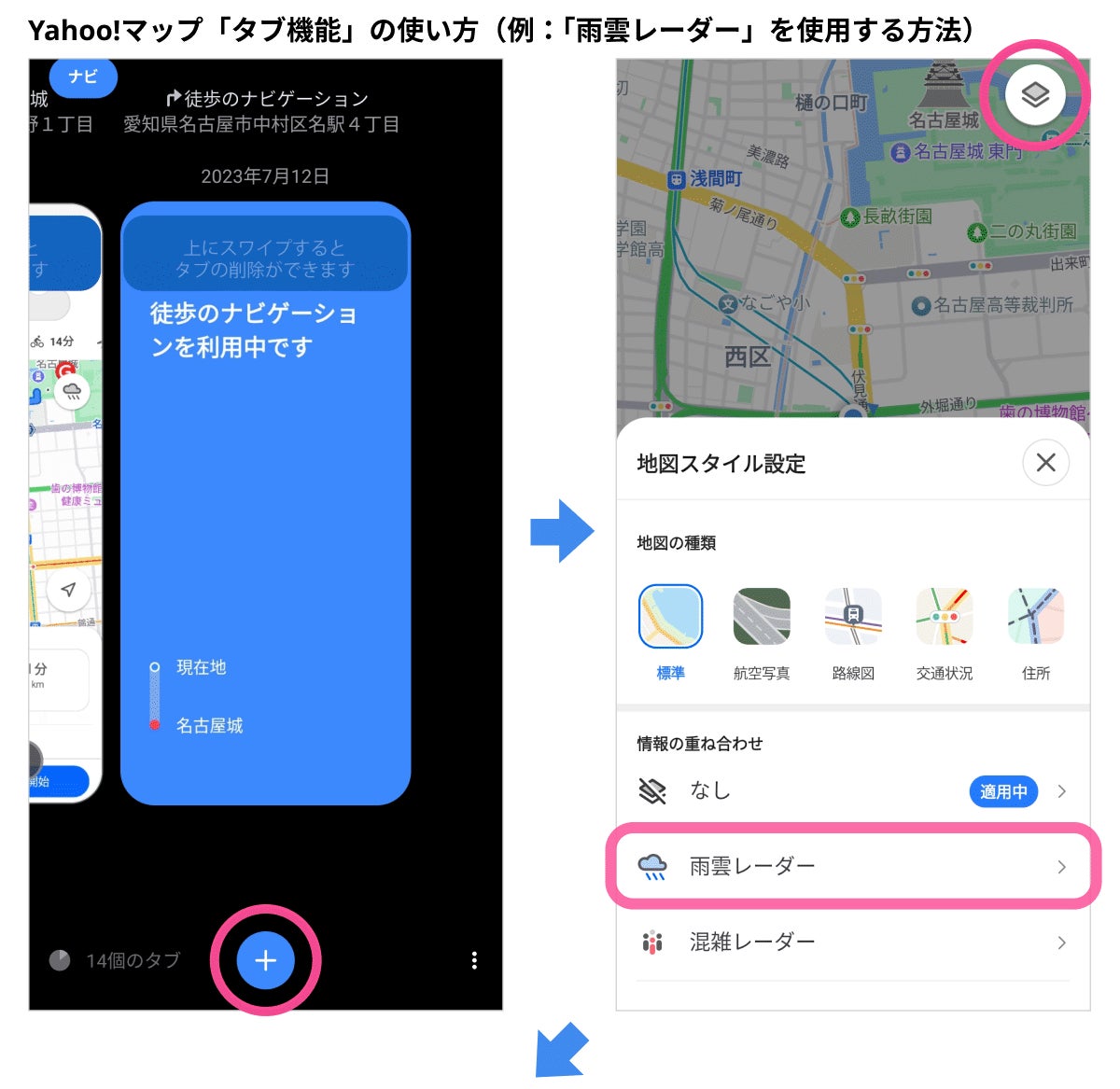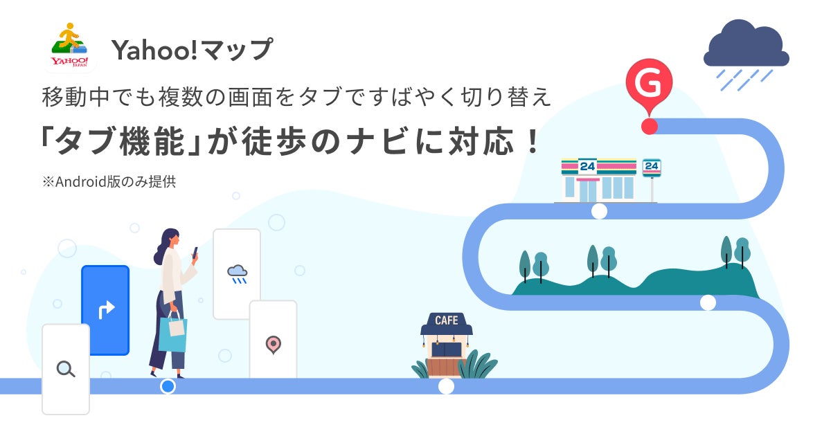 ヤフー株式会社(以下、Yahoo! JAPAN)が提供する「Yahoo!マップ」(Android版)は、別のアプリやブラウザーを開くことなく、地図で調べた場所やルートなどを複数のタブで表示できる「タブ機能」(※1)を、「徒歩のナビ」で対応しました。これにより、「徒歩のナビ」を使用しながら別のタブを開いて周辺施設の検索や雨雲レーダーの確認などが可能になります。