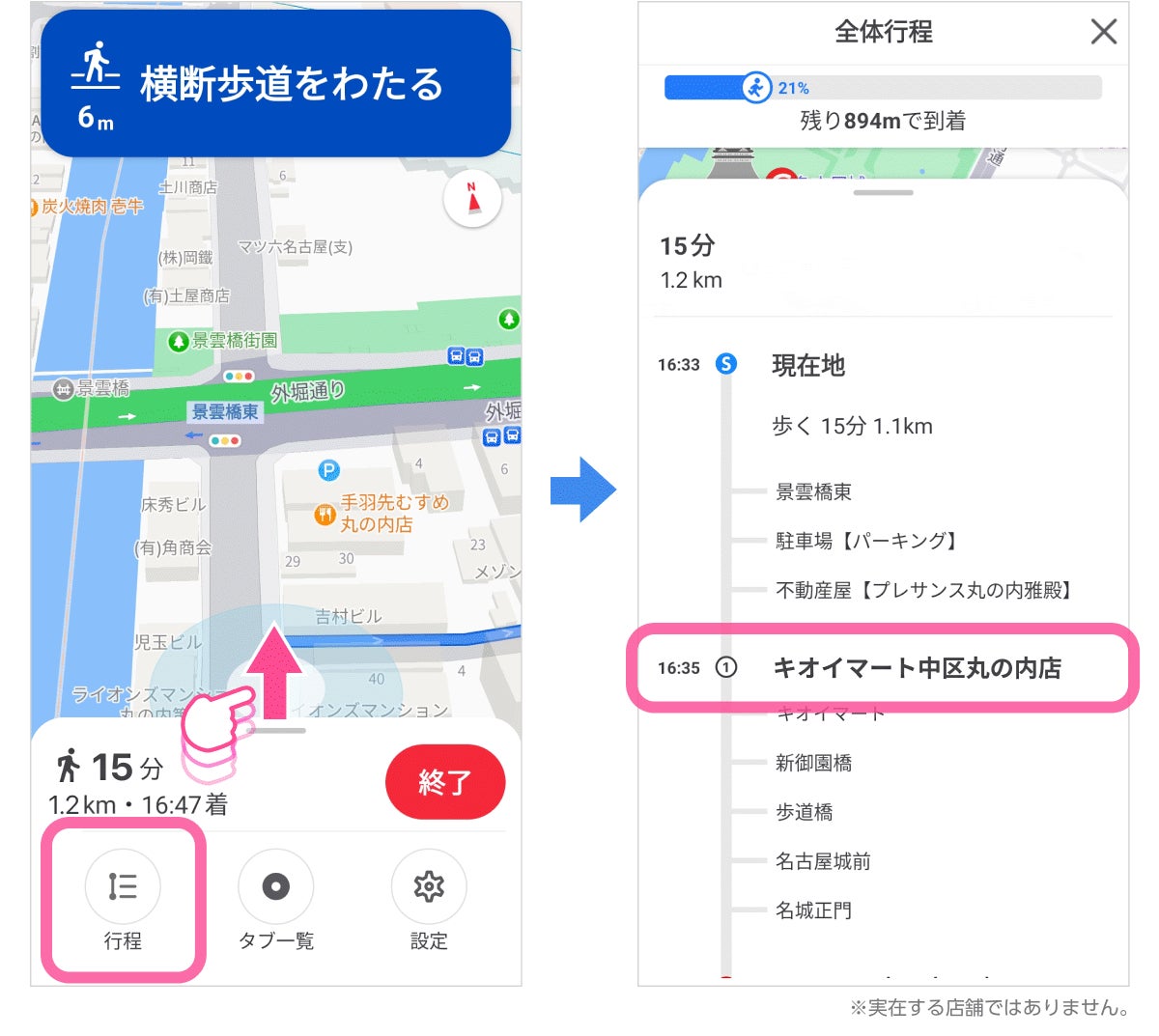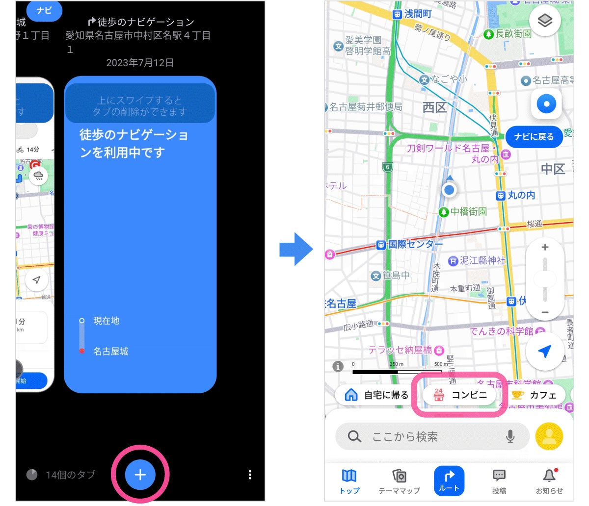 ■「徒歩のナビ」を使用しながら新しいスポットを探す方法(例:コンビニエンスストアに立ち寄る場合)