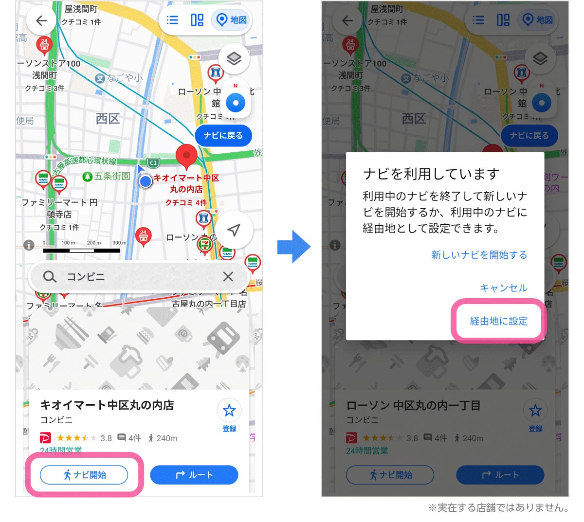 ・立ち寄りたいスポットをナビ中の経由地に設定したい場合は、ナビ開始をタップし、次の画面で「経由地に設定」を選択