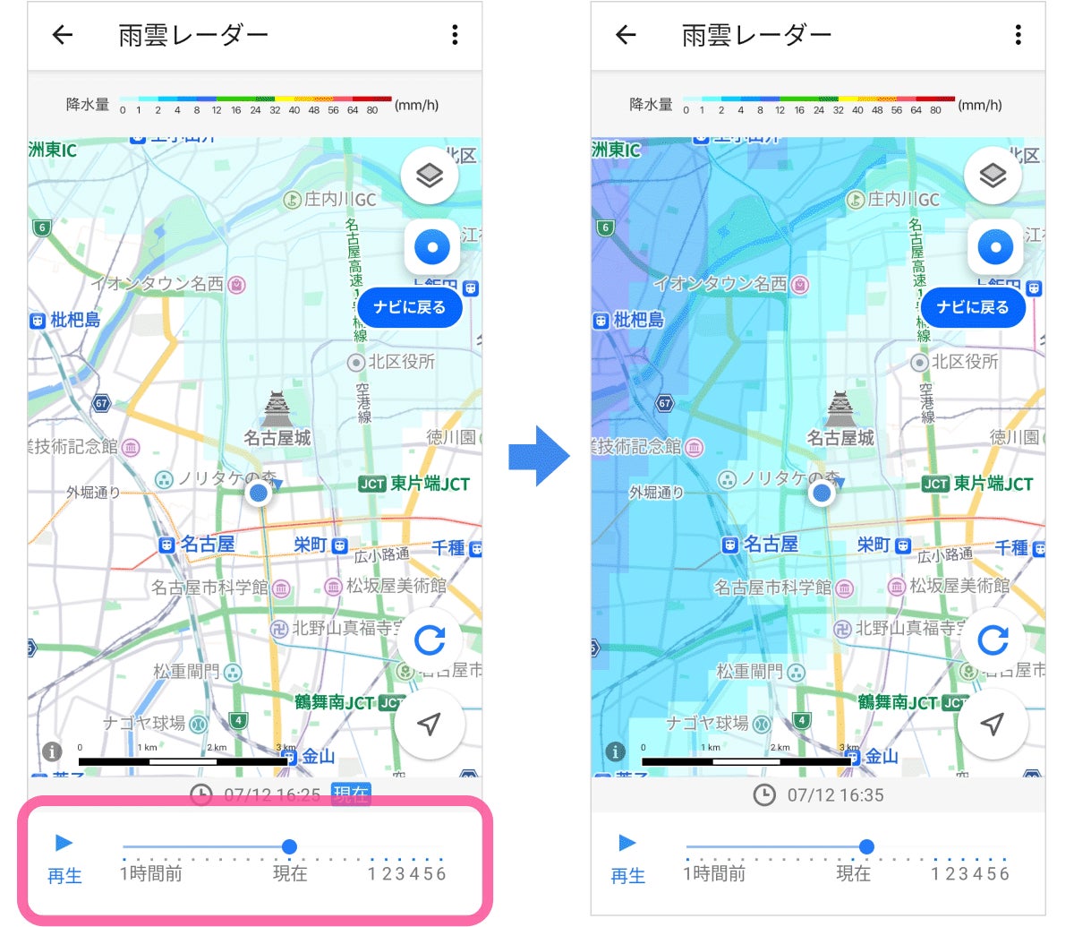 ・「雨雲レーダー」を開いたら、下部のボタンをタップまたはスライドバーを操作することでこの先6時間までの雨雲の動きが確認可能