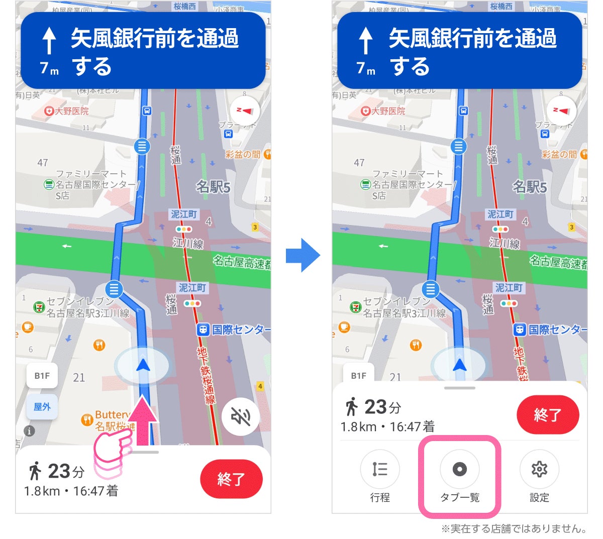 ・「徒歩のナビ」の画面上で、下部を引き上げて「タブ一覧」をタップ