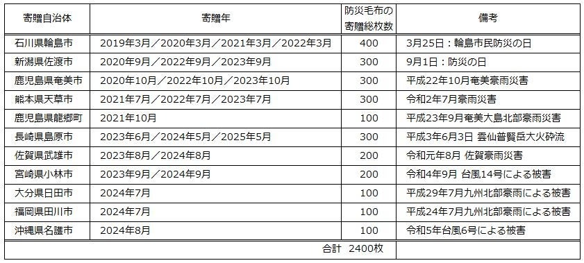 青山商事株式会社(本社:広島県福山市/代表取締役社長:遠藤 泰三)は、福岡県田川市へ「防災毛布(災害支援用リサイクル毛布)」100枚を寄贈いたします。これに伴い、7月10日(木)に田川市役所にて贈呈式を開催します。当社は2018年より、お客様から回収した不要衣類の一部をリサイクルし、防災毛布を作製しています。2019年から自治体の災害対策を支援する取組を開始し、これまでに国内で計11箇所・総数2400枚を寄贈しており、田川市へは2024年7月に続き2度目の寄贈となります。