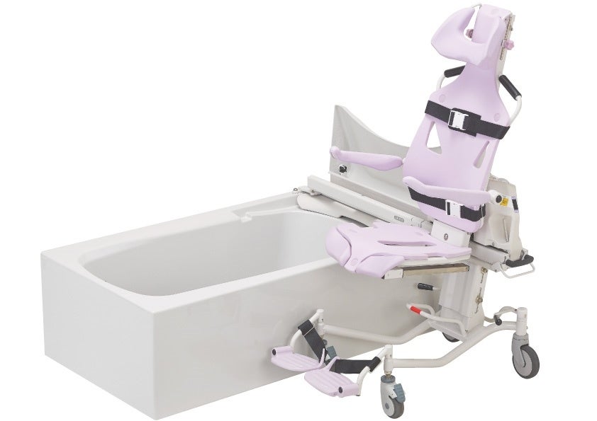 専用レール内蔵式バスタブ又は、工事不要の専用レールを既存の浴槽に設置するだけで使用できる入浴用リフト。キャリーのスライドによりご利用者を吊り上げることなく、簡単・スピーディに入浴できる。